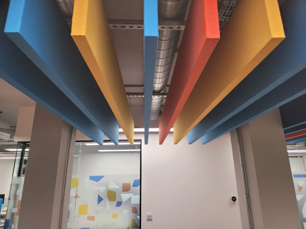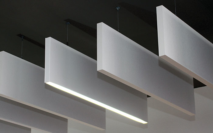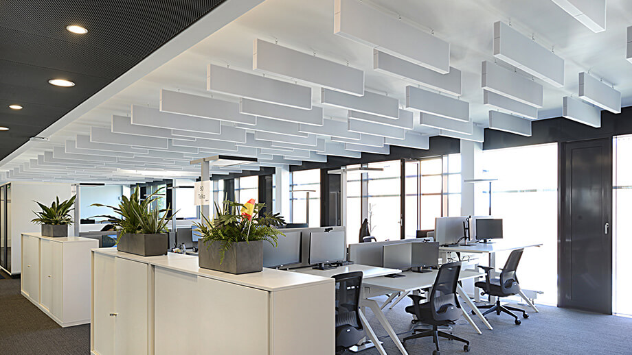 Solução eficaz para melhorar significativamente a acústica de um ambiente, principalmente nos casos em que as superfícies disponíveis de forro e parede são insuficientes para obter uma absorção sonora ideal. Os painéis que absorvem o som são suspensos verticalmente a partir da laje ou do forro e têm absorção sonora em ambos os lados, reduzindo o nível de ruído em uma sala e melhorando a qualidade acústica. Para um visual extraordinário e leve, os baffles podem ser fixados usando cabos de aço noxidável quase invisíveis.