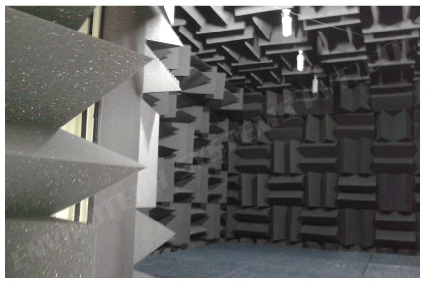 A distância da base até a ponta da estrutura piramidal é designado tendo como base a menor frequência esperada e a quantidade de absorção necessária. Para baixas frequências, esta distância é geralmente 24 polegadas, enquanto painéis de alta frequência são tão pequenos quanto 3–4 polegadas. Painéis de material absorvente são instalados com as pontas apontando para dentro da câmara. Material piramidal atenua o sinal através de dois efeitos: dispersão e absorção. A dispersão pode ocorrer tanto coerentemente, quando as ondas refletidas estão em fase, mas direcionadas para longe do receptor, quanto incoerentemente quando as ondas são captadas pelo receptor mas estão fora de fase e assim tem intensidade de sinal menor. Esta dispersão incoerente também ocorre dentro da estrutura da espuma, com as partículas suspensas de carbono promovendo interferência destrutiva. Dispersão interna pode resultar em atenuação na ordem de 10 dB. Enquanto as formas piramidais são cortadas em ângulos que maximizam o número de vezes que a onda reflete dentro da estrutura. Em cada reflexão a onda perde energia no material da espuma e assim volta com uma intensidade de sinal menor.