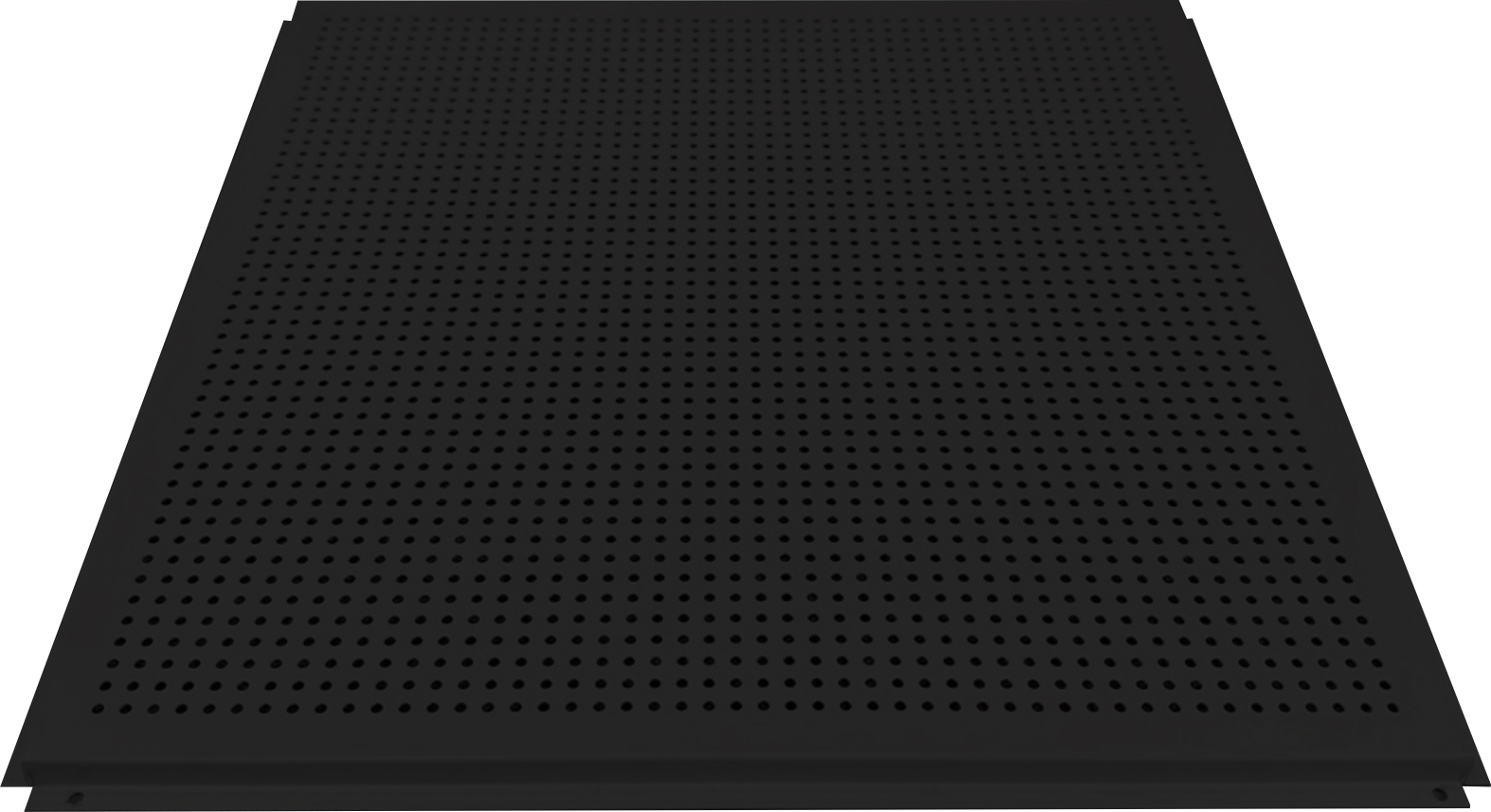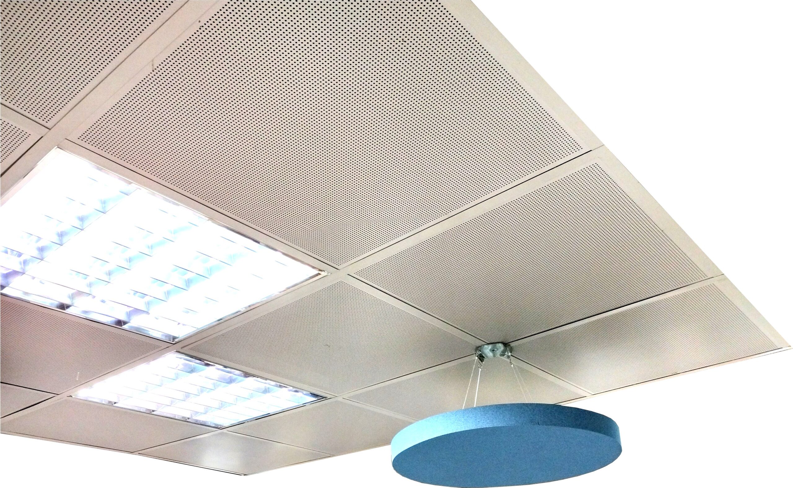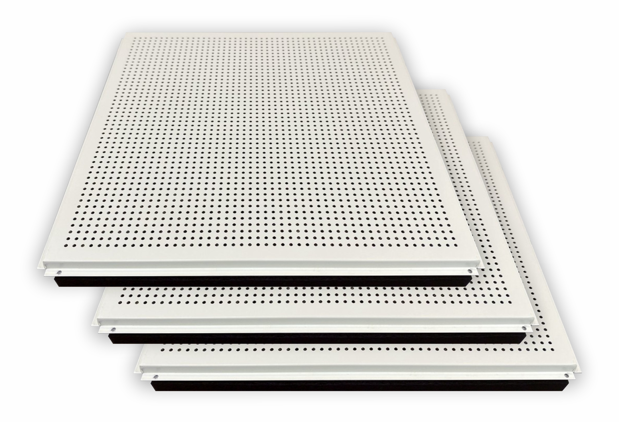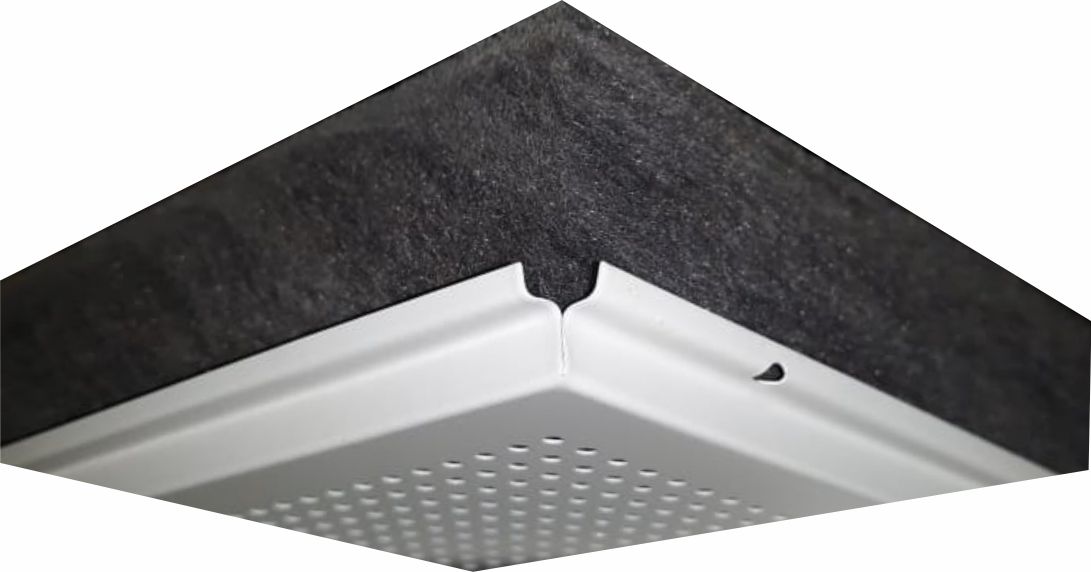 Forro Acústico Sonique Metal é fabricado em aço galvanizado com acabamento em pintura eletrostática na cor branco gelo ou preto. Para reforçar a absorção acústica, internamente possui uma camada de Lã de Pet.