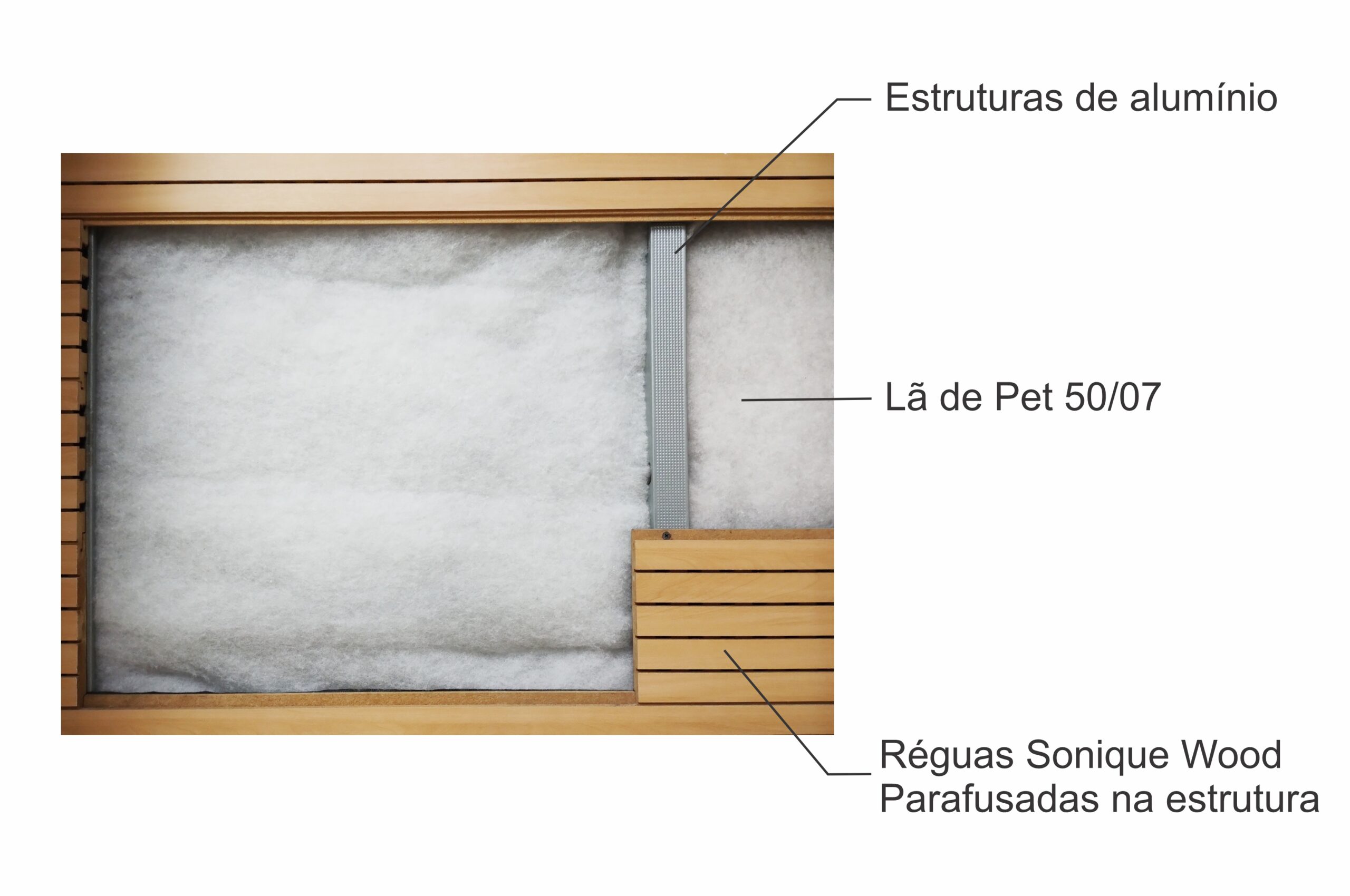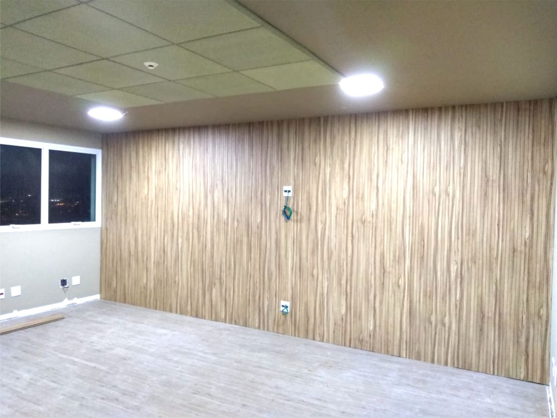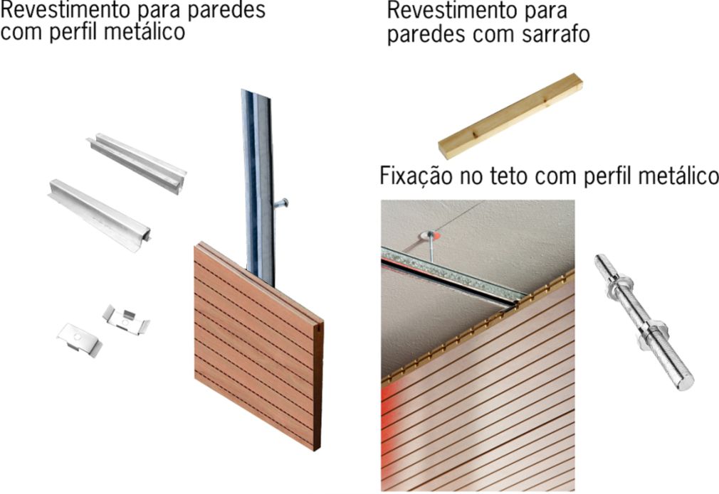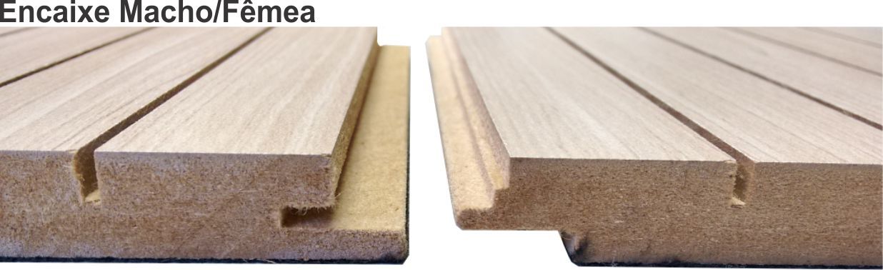 - Painel de madeira revestido com superfície frisada disponível em réguas de 2750 x 160mm, borda macho/femea, instalado com perfis, feltro de lã de pet e parafusos
