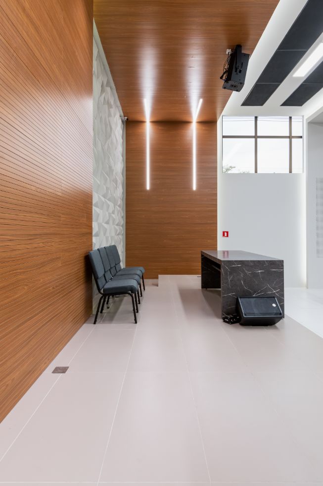 O Painel Acustico Sonique Wood é utilizado como absorvedor sonoro devido à sua perfuração, proporcionando conforto acústico.