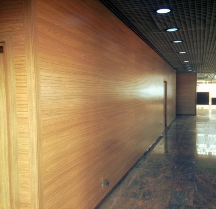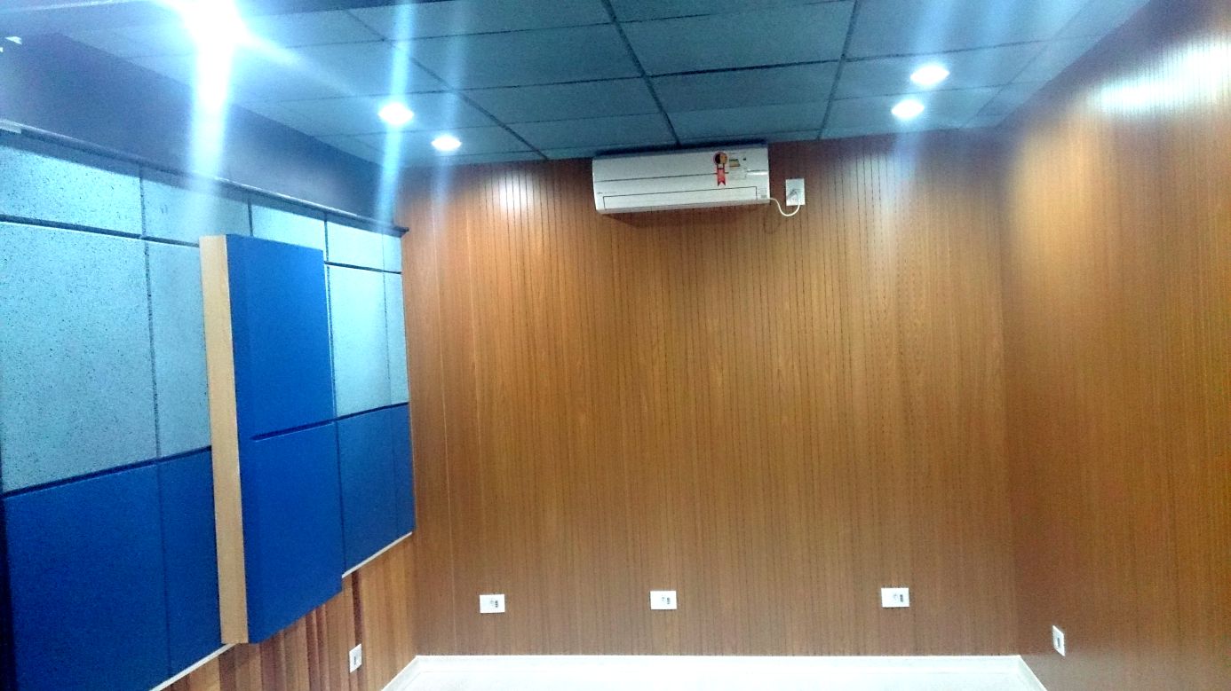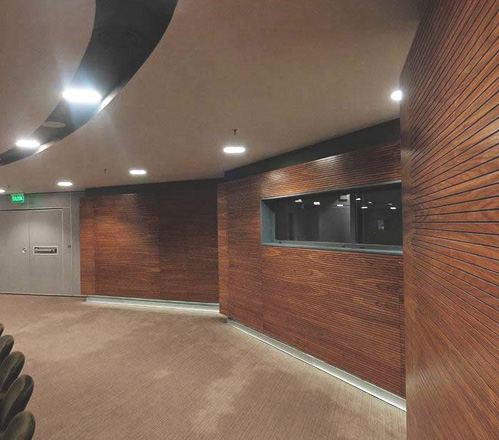 Painel acustico de MDF proveniente de materia prima certificada com selo FSC Classe E1 revestido em melamina padrão amadeirado ou folha de madeira.