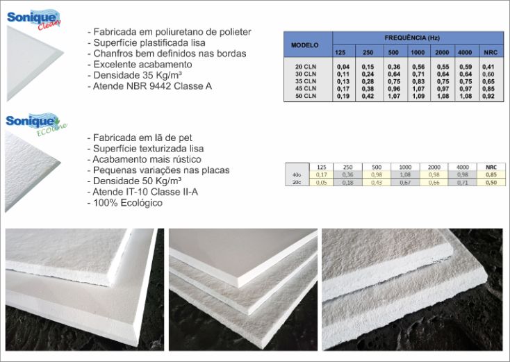 – A linha Sonique Clean Nofire-Fireproof é confeccionada em Espuma de poliuretano mineralizada, com cargas intumescentes e células abertas, com superfície perfurada. Material auto-extinguível (Não propaga o fogo).