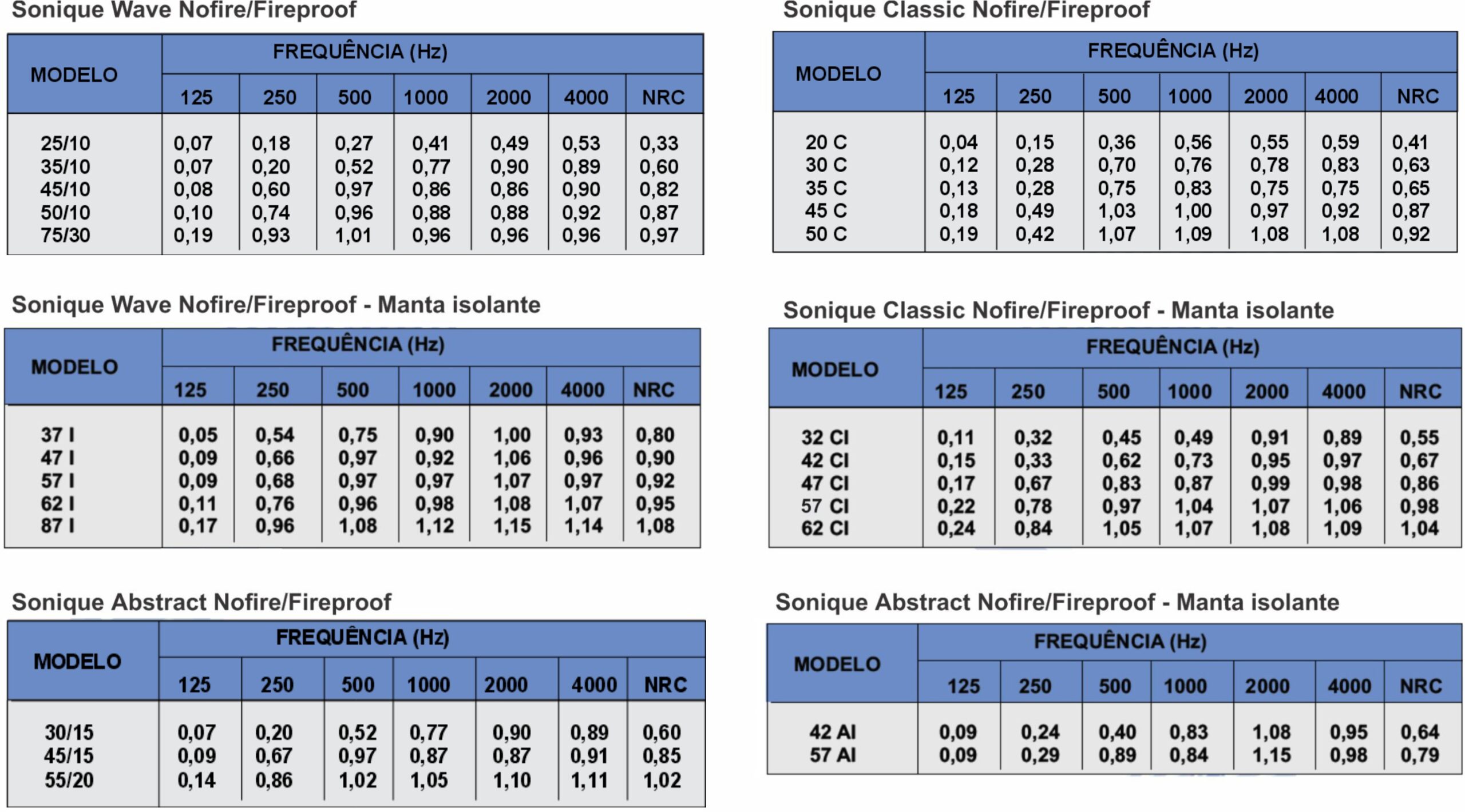 Os coeficientes de absorção da linha NoFire são os mesmos da linha convencional pois trata-se da mesma espuma com aditivos anti chama utilizados na sua confecção.